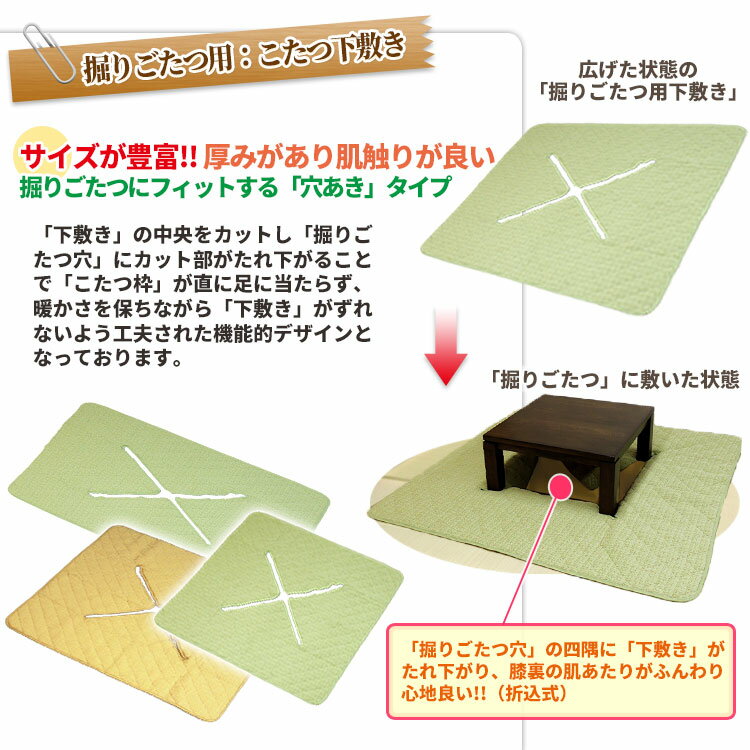 下敷きの中央をカットしカット部がたれ下がることでこたつ枠が直に足に当たらず、暖かさを保ちながら下敷きがずれないよう工夫された機能的デザインとなっております。